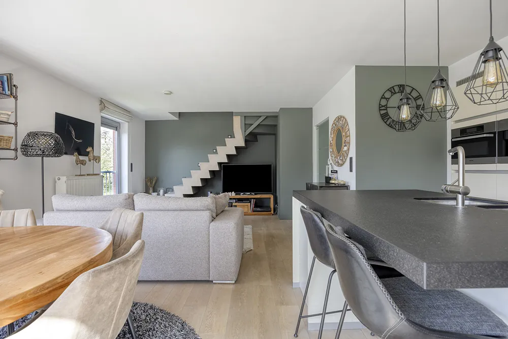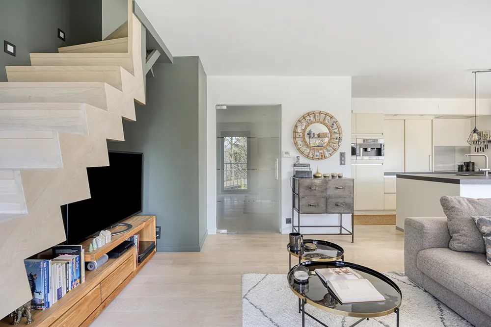 It is situated on the first floor and features an entryway with a half-bath, a very bright living area, and an open, fully equipped kitchen with high-end appliances (Miele, built-in coffee machine, combi-oven, dishwasher). There is currently no wine fridge, but the connection for one is already in place.
