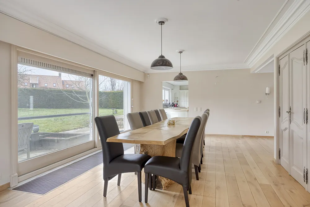 Une salle à manger pouvant accueillir confortablement jusqu’à 12 convives. L’ensemble du rez-de-chaussée est entouré de grandes baies vitrées offrant une vue imprenable à 270 degrés sur le jardin du parc, créant une parfaite harmonie entre l’intérieur et l’extérieur.