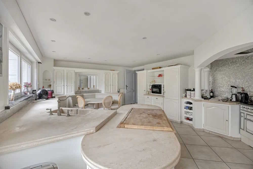 Le cœur de cette demeure est sans aucun doute la cuisine en travertin. Cette pierre naturelle, tendance dans le haut de gamme, respire l’élégance. Avec une cuisinière classique au gaz (type Boretti), de multiples îlots et de vastes plans de travail, c’est le rêve de tout amateur de cuisine ou de votre chef professionnel.