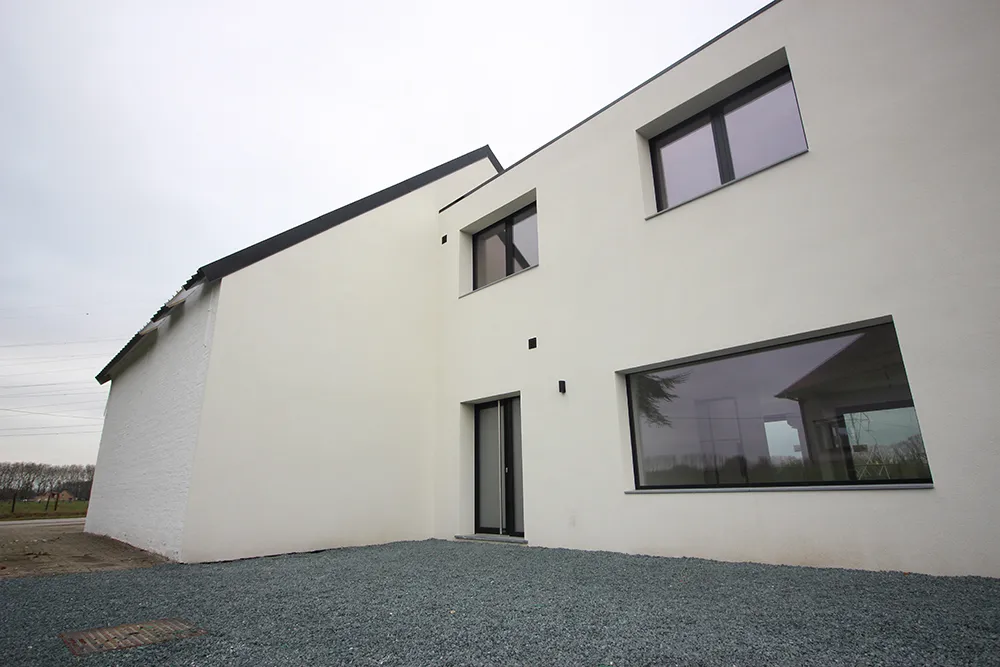 De werkplaats en woning samen zijn gelegen op 8 are grond. Deze woning is futureproof met eveneens (bovenop de parking van de werkplaats) nog eens twee privatieve parkeerplaatsen voor de deur met voorzieningen laadpaal (elektrisch rijden). We komen binnen via een ruime inkomhal met apart gastentoilet, die ons naar de leefruimte brengt met open keuken met eiland. De leefruimte en open keuken is met grote schuiframen (gevelbreedte 8m) helemaal open getrokken naar het terras met tuin. Achteraan de tuin is een toegangsweg die langs buiten directe toegang tot de tuin verleent.