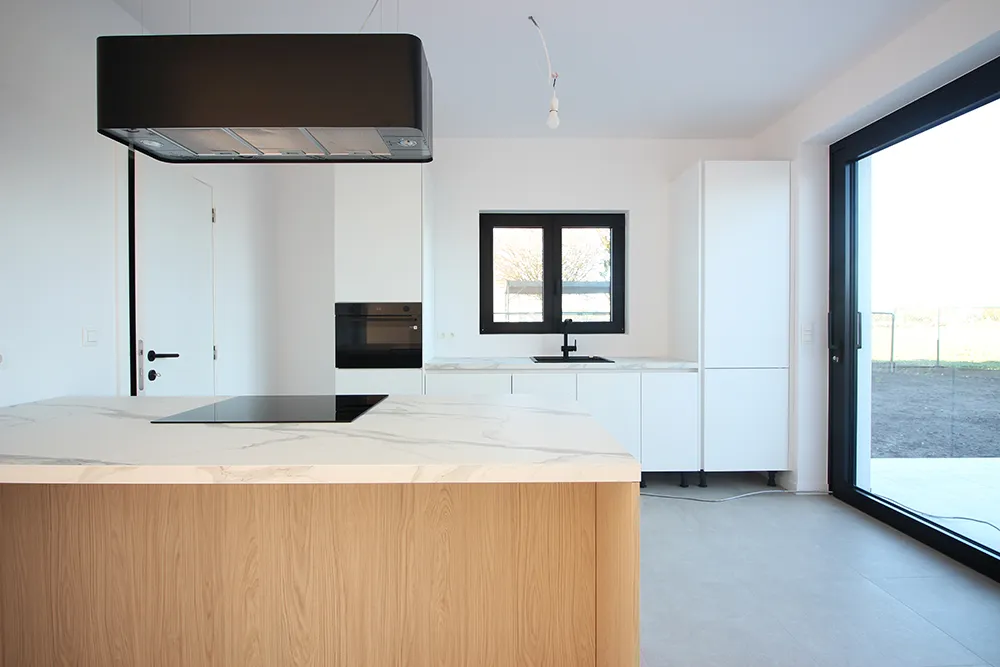 Op de foto’s in deze advertentie is de keuken nog niet volledig afgewerkt (dit gebeurt tegen het verlijden van de akte en na verplaatsing elektriciteitsmeter naar de berging).