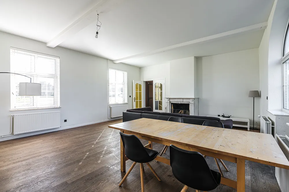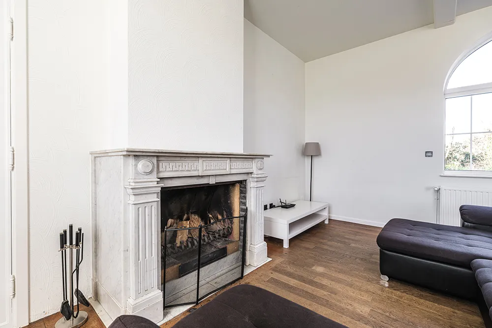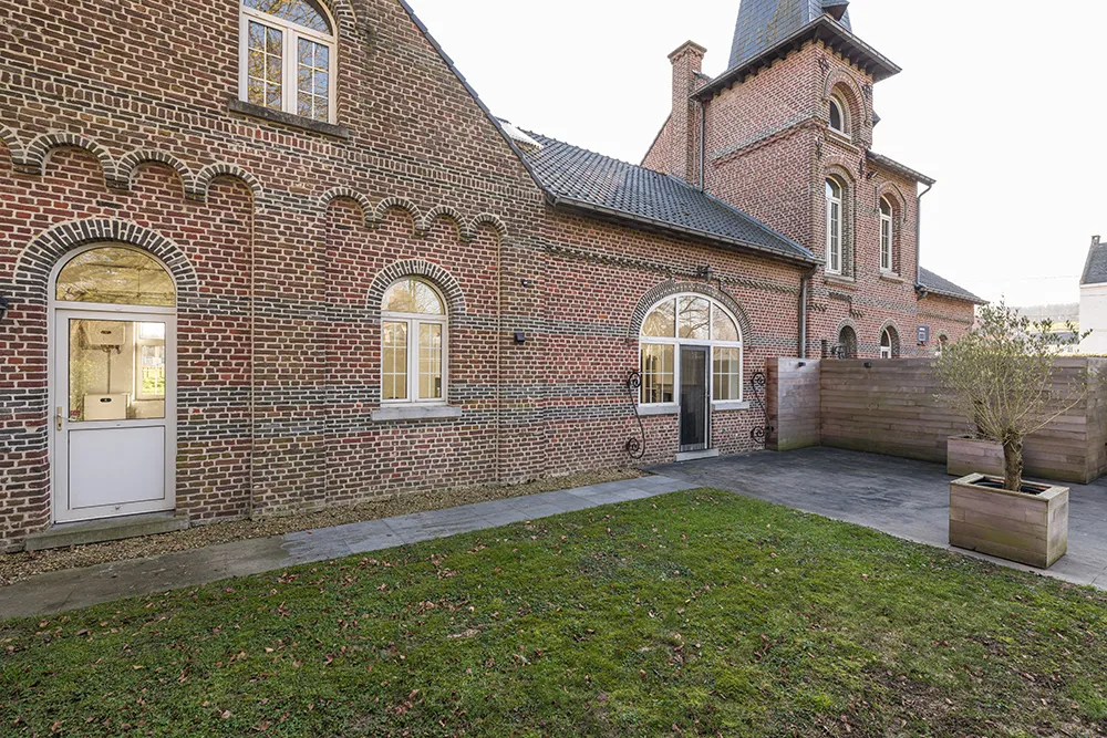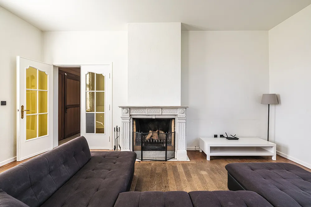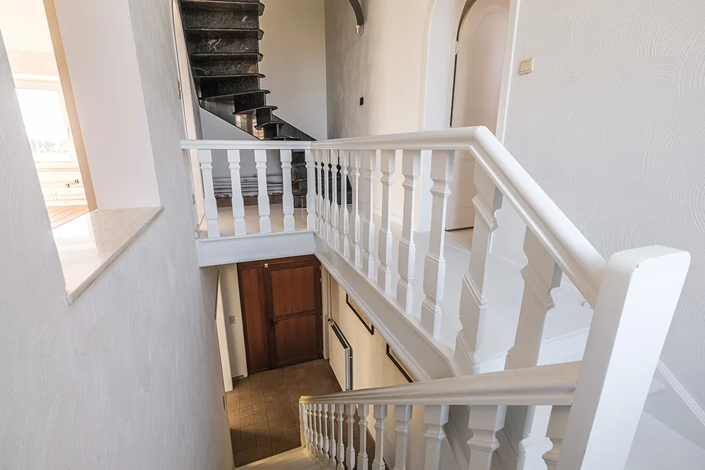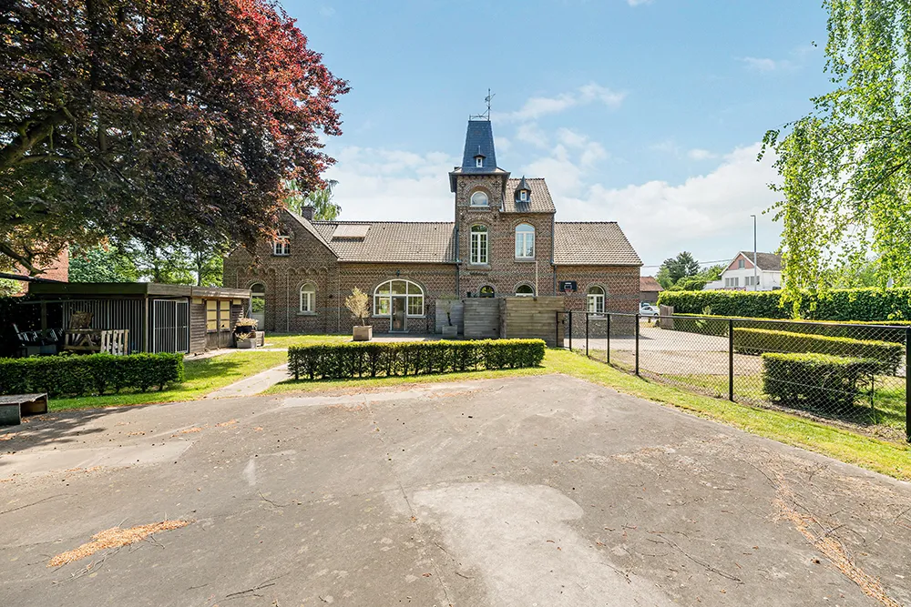 De ruime en lichtrijke leefruimte met marmeren schouw heeft een open haard wat de ruimte die extra gezellige touch geeft. Aansluitend is er de te renoveren keuken met naastliggende technische berging. Zowel de leefruimte als naastliggende ruimtes hebben een vlotte toegang tot de tuin/terras. Er zijn visualisaties beschikbaar met de verschillende mogelijkheden. Aan de linkerzijde van de trapzone is er het "kantoor"gedeelte. Hier zijn verschillende invullingen mogelijk. Op de bovenverdieping zijn minimaal 3 ruime slaapkamers en een mooi uitgeruste en grote badkamer voorzien. De mastersuite heeft nog aansluitend een ruime dressing. Idem wat betreft de andere slaapkamer aan de linkerzijde van het pand. Met de zone in de torenkamer zijn er ook nog verschillende andere invullingen mogelijk. Deze is bereikbaar met een volwaardige trap.