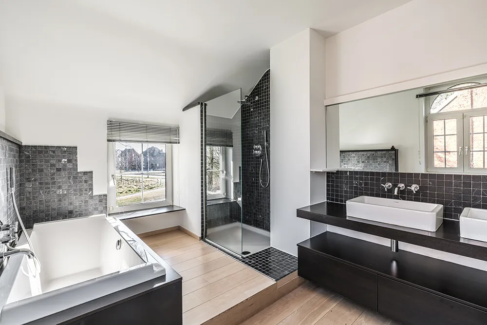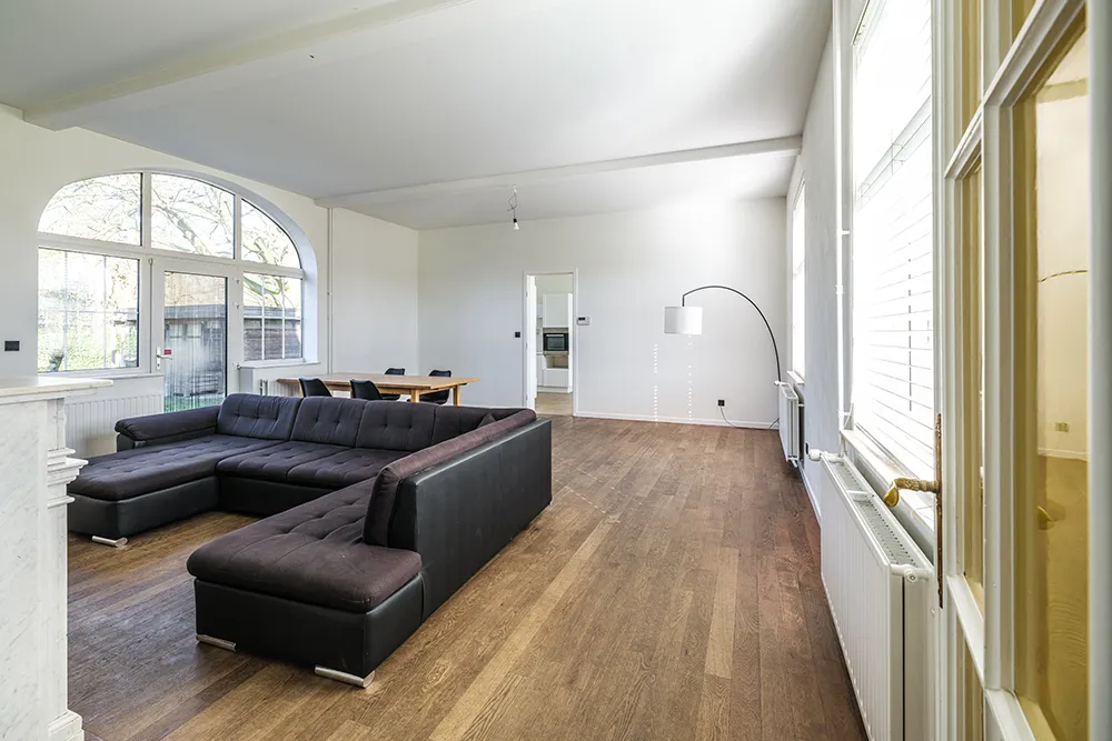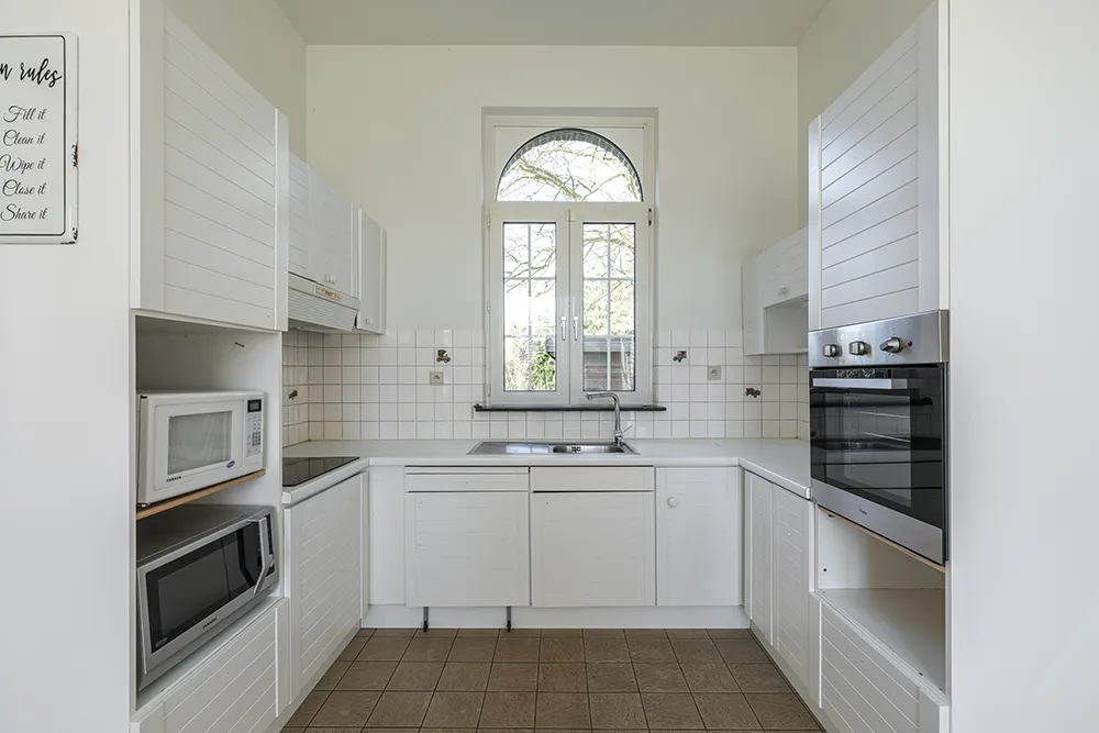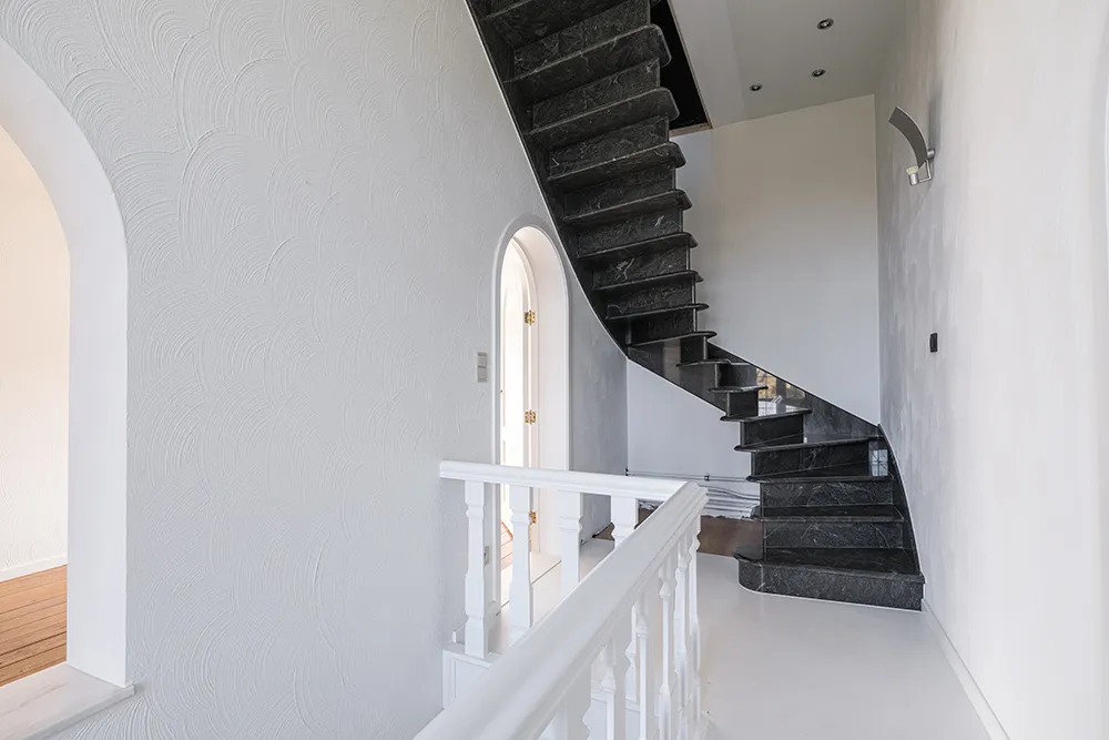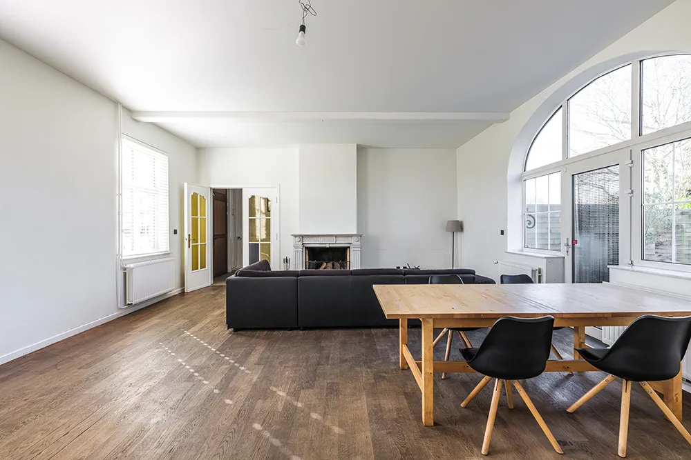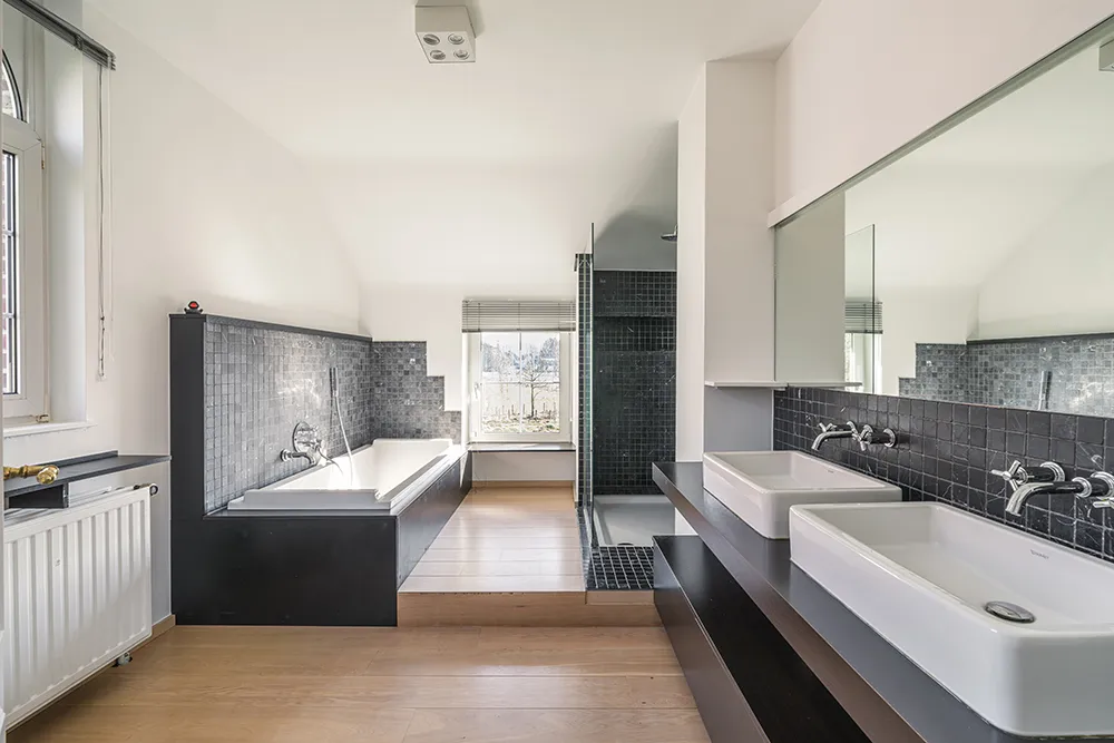 De ruime en lichtrijke leefruimte met marmeren schouw heeft een open haard wat de ruimte die extra gezellige touch geeft. Aansluitend is er de te renoveren keuken met naastliggende technische berging. Zowel de leefruimte als naastliggende ruimtes hebben een vlotte toegang tot de tuin/terras. Er zijn visualisaties beschikbaar met de verschillende mogelijkheden. Aan de linkerzijde van de trapzone is er het "kantoor"gedeelte. Hier zijn verschillende invullingen mogelijk. Op de bovenverdieping zijn minimaal 3 ruime slaapkamers en een mooi uitgeruste en grote badkamer voorzien. De mastersuite heeft nog aansluitend een ruime dressing. Idem wat betreft de andere slaapkamer aan de linkerzijde van het pand. Met de zone in de torenkamer zijn er ook nog verschillende andere invullingen mogelijk. Deze is bereikbaar met een volwaardige trap.