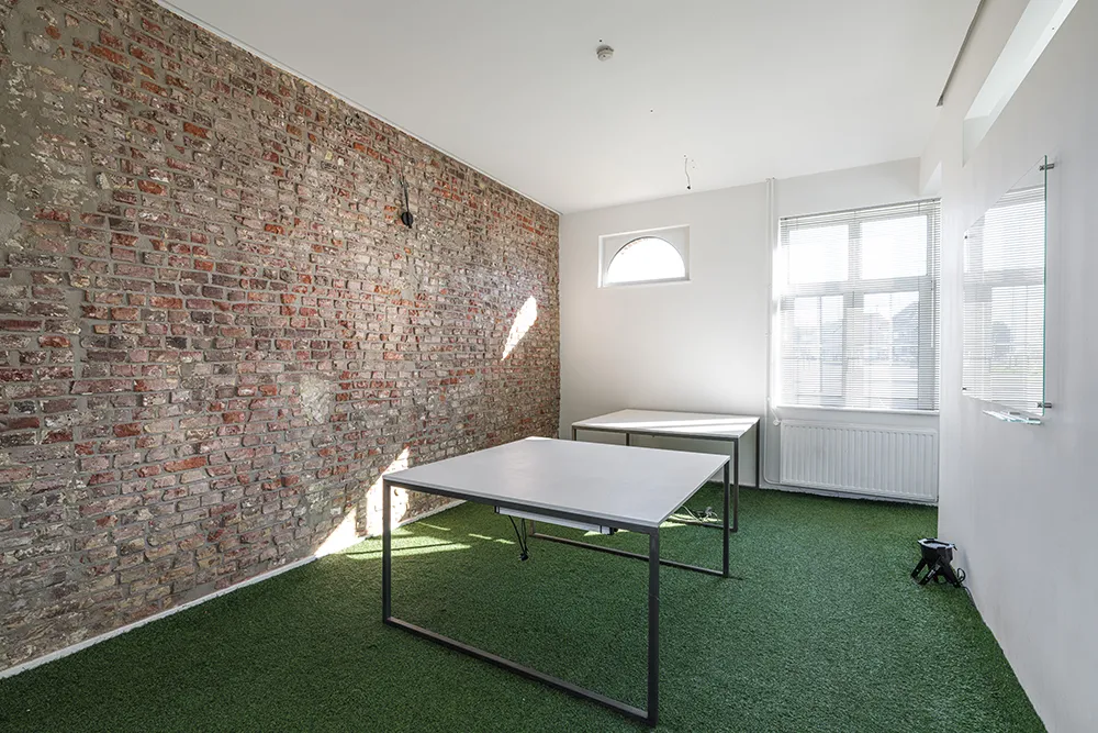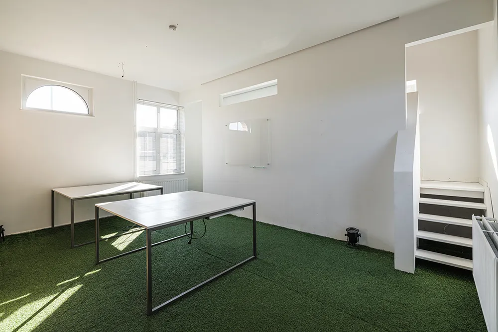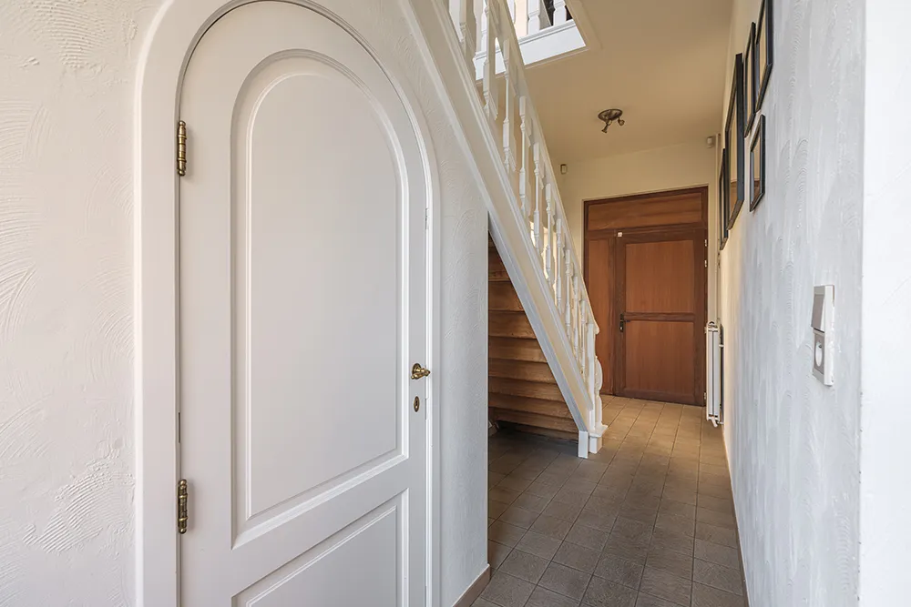 De mooie houten voordeur staat centraal en deelt het pand makkelijk op in het privé gedeelte en het "kantoor" gedeelte. Het ruim kantoor bevindt zich aan de linkerzijde. Deze zone kan makkelijk worden betrokken bij het privé gedeelte.