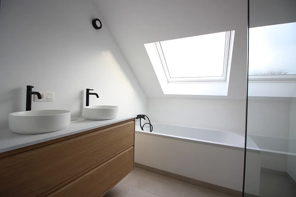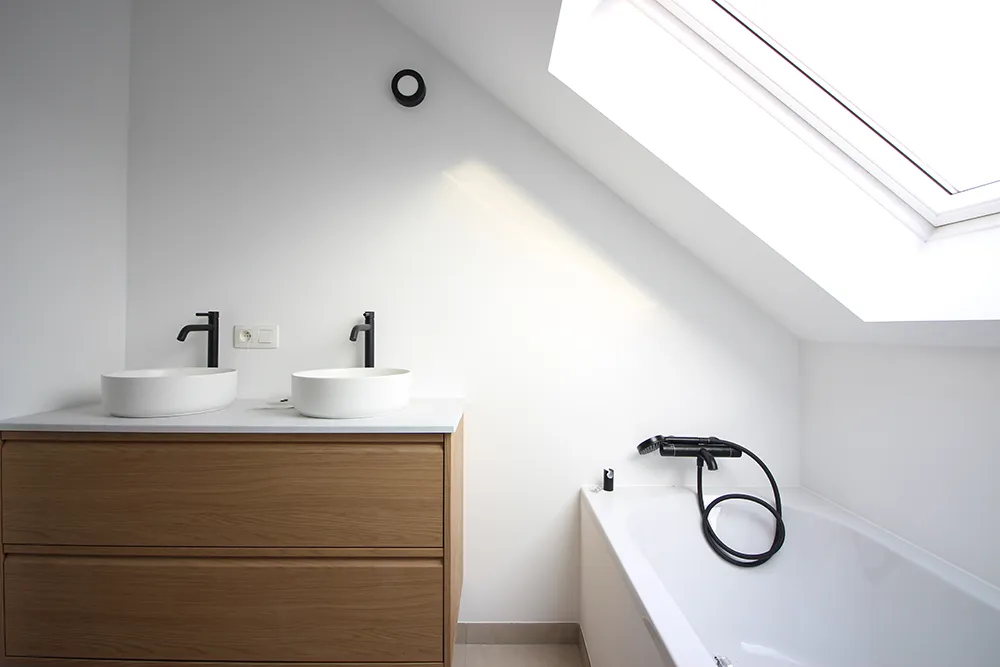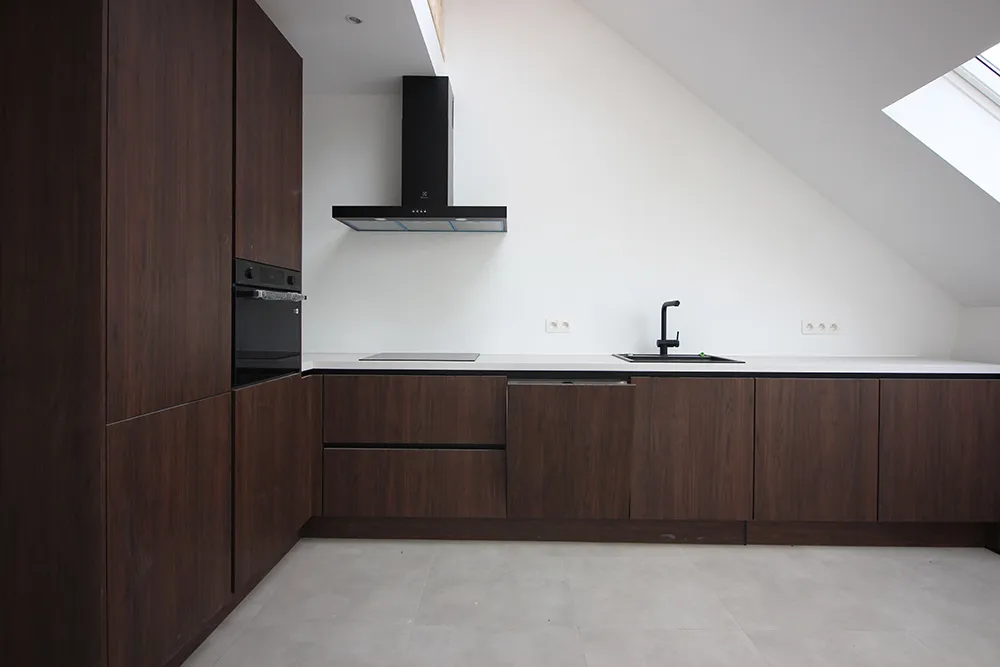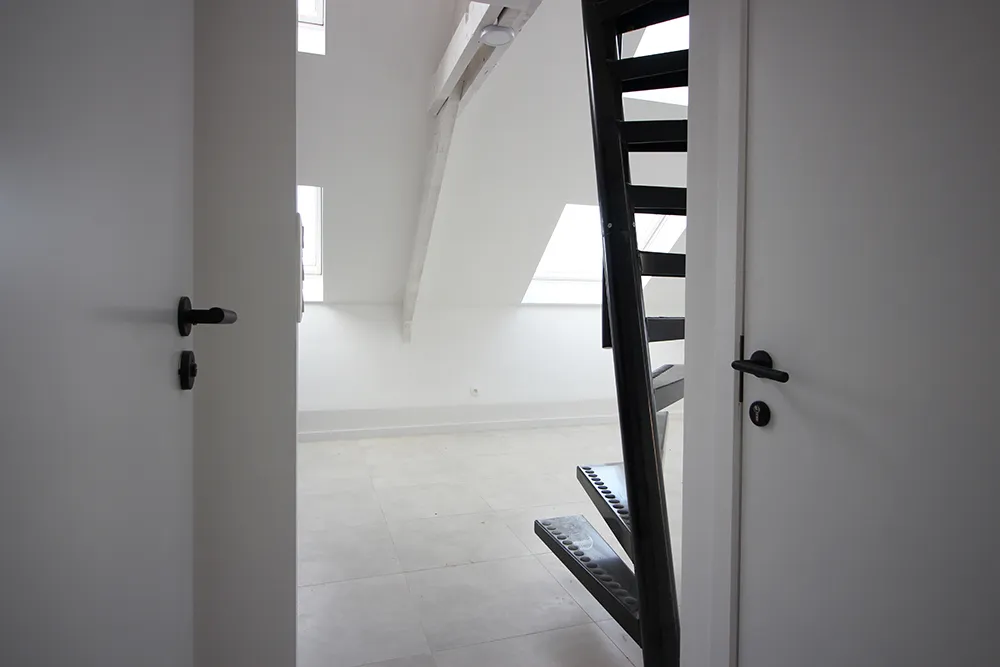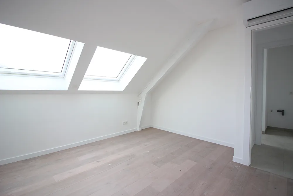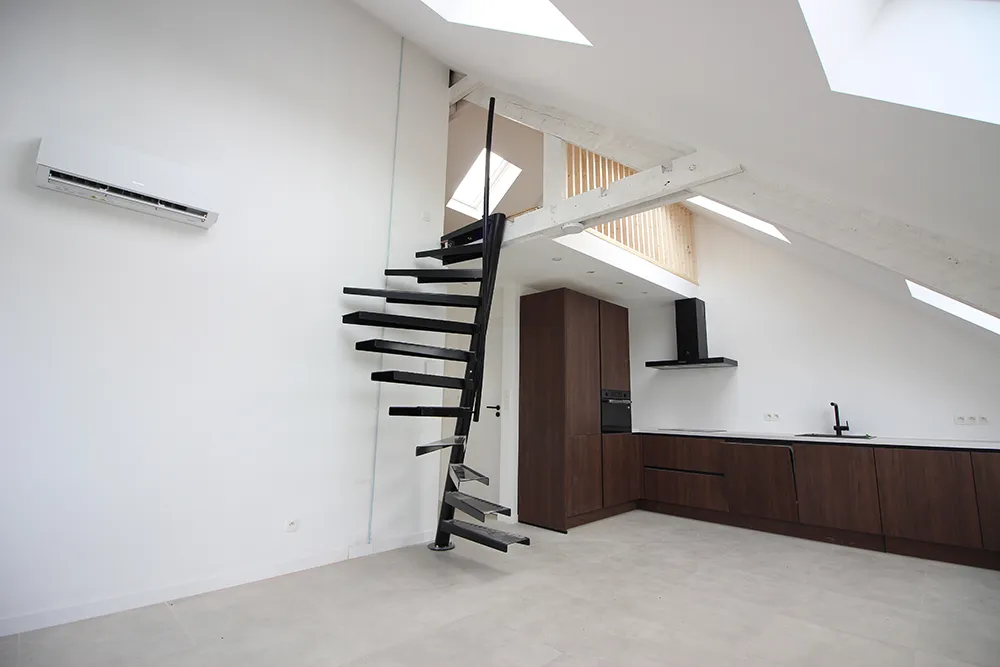 Dit dakappartement is gelegen op de derde en hoogste verdieping in een appartementsgebouw dat in 2025 tot op de blote structuur volledig gestript en gerenoveerd werd naar een energiezuinig appartement (A-label) met warmtepomp en individuele zonnepanelen. Een gloednieuwe keuken, badkamer, … alles is spiksplinternieuw en nog nooit gebruikt. Dit appartement heeft een enorm leuke “vibe” door de zeer lichtrijke living onder hoog dak met mezzanine die als bureauruimte of slaapmezzanine gebruikt zou kunnen worden. Het dakappartement heeft een afgesloten slaapkamer van 13m2 en een de ruimste badkamer van het gebouw met zowel ligbad, inloopdouche, dubbele wastafel alsook plaats voor was - en droogmachine. Verder is er ook nog een apart gastentoilet. In het gebouw is ook een fietsenstalling waar dit appartement zijn eigen individueel aangesloten stopcontact heeft (ideaal voor opladen, elektrische fiets(en)). Bij het appartement dient eveneens verplicht een autostaanplaats vooraan het gebouw gehuurd te worden (70 euro/maand). Bij deze autostaanplaats is tevens bekabeling voorzien voor een individueel laadpunt (elektrische wagen). De maandelijkse lasten in het gebouw zijn met 25 euro/maand zeer laag. Alle meters zijn individueel (water en elektriciteit) met dus ook zonnepanelen erop. Dit gebouw is ook nog eens gelegen in een zeer gegeerde buurt van Leuven/ Kessel-Lo, achter het station. Het appartement is beschikbaar vanaf 1 december 2025.