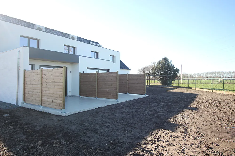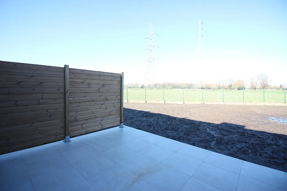 De leefruimte is door een lichtkoepel en grote ramen (gericht op terras en tuin) zeer lumineus. Vanuit de leefruimte kan het terras betreden worden dat uitkijkt op de tuin en het agrarisch gebied erachter (waar nooit een bebouwing kan komen). Achteraan de tuin is een toegangsweg die langs buiten directe toegang tot de tuin verleent.